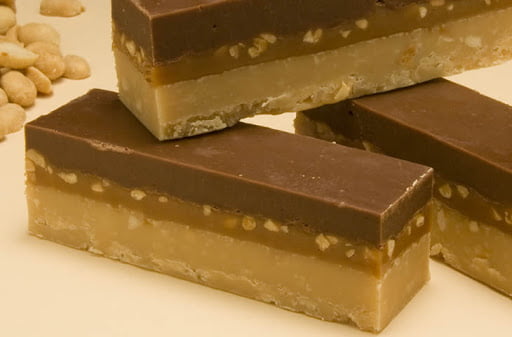 together 3 cups sugar, honey, peanut butter, and 1/2 cup water to soft ball